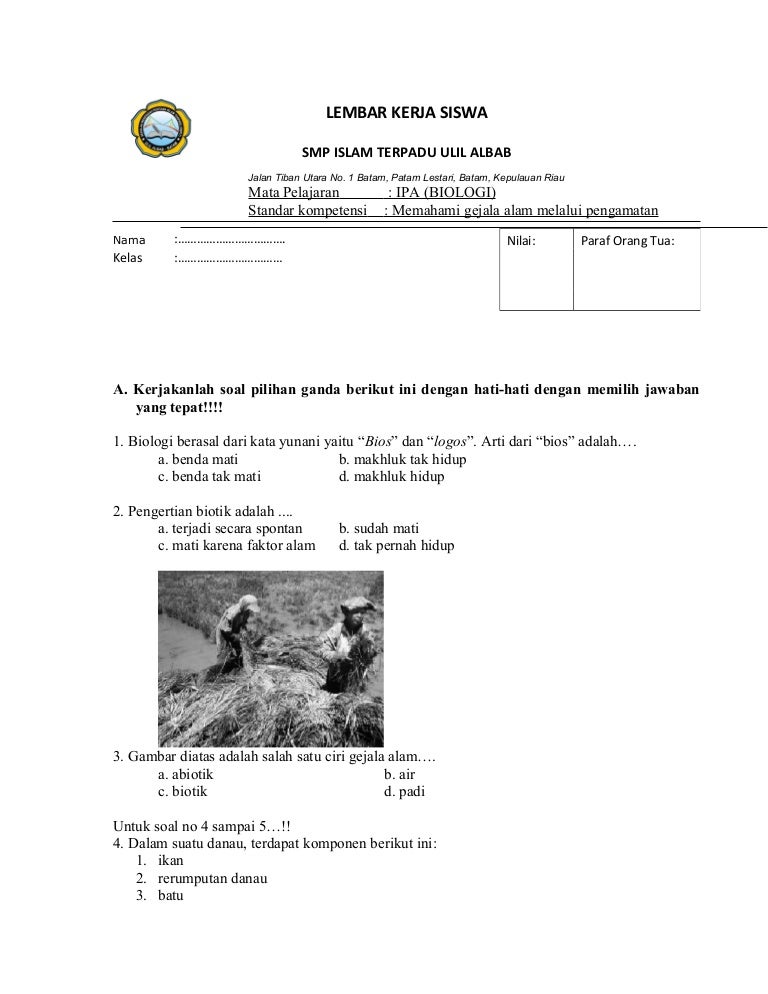 Soal Essay Tentang Biotik Dan Abiotik Masnurul from i0.wp.com Hubungan komponen biotik dan abiotik. Jadi soal yang terdapat makhluk hidup/biotik tidak termasuk jawaban yang diminta di soal ini. Kali ini saya akan membagikan tentang komponen biotik dan abiotik. Di dalam ekosistem terjadi saling ketergantungan antar komponen, sehingga apabila salah satu komponen mengalami gangguan maka mempengaruhi komponen lainnya. Suatu kesatuan komponen biotik dan abiotik yang saling berinteraksi. Lumut kerak terdiri atas komponen fungi yang berasosiasi dengan komponen alga (cyanobactaria). Komponen abiotik adalah kondisi fisik dan kimia di sekitar. Menambah tinggi kualitas lingkungan d.
